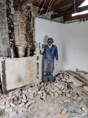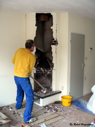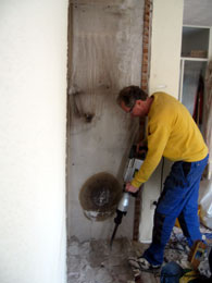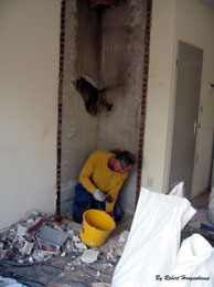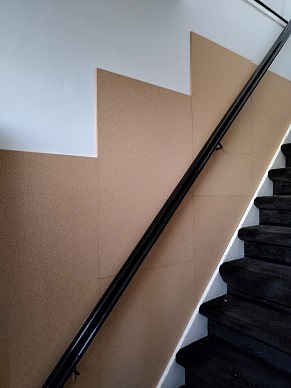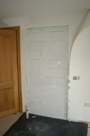 | In Baarn, in een jaren-30 huis, was een steens-muur zonder spouw steenkoud. Die muur heb ik beplakt met 1 cm dik kurk met een zelfklevende laag. Aan de prijs maar zeer effectief. Op de foto is de muur nog niet helemaal gedaan.
