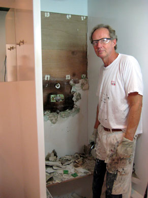 Lekkages rond kranen en boven de badrand hebben gipsplaten en stucwerk aangetast in een badkamer in Amsterdam die niet betegeld was.