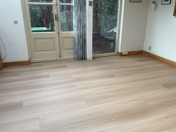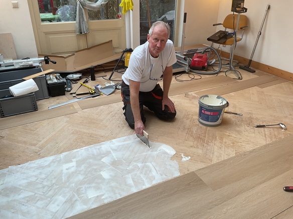 Plakken van 60 m2 PVC-vloer in Utrecht, in 3 verschillende ruimtes en alles aan elkaar doorgelegd. De stoffeerder die dit werk dagelijks doet kan het veel sneller maar die eist dat de hele verdieping leeg is, dat is voor de meeste mensen niet haalbaar. |
