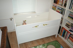 Van donkerblauw naar gebroken wit met watergedragen verf; een kinderledikantje met herinneringen mag wat kosten. |