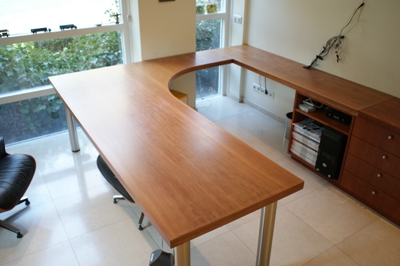 Het lakken met traplak van dit bureaublad stelt niets voor, maar het verwijderen van de oude en door de zon sterk vergeelde laklaag heeft 3 uur gekost.
